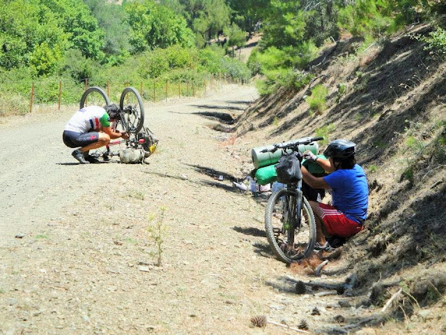 Kıranlı-Çobanlar arasından vadi yoluyla ,Çürükbağ’ a inerken lastik patlağı. Burada çalılar çok sert,dikenleri de var,yola saçıldığı için lastiklere dikkat etmek gerekir.Ama sorun değil hemen halledip yola devam ediyoruz.