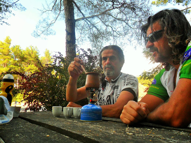 ilçenin orta yerindeki parkta herkesin içinde nescafemizi yapıp bir güzel içiyoruz.Sonrada yola çıkıyoruz,Burhaniye-Edremit yolu trafiğe kapalı bize açık, boş yolda pedallıyoruz.
