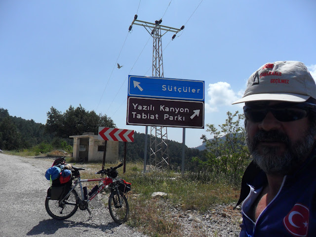Bu yol ayrımına gelmeden önce Boğazköy’de su kenarın da mola verip öğlen yemeği mi yedim.Tabii yanıma gelen giden çok oldu….Muhabbet anında Yazılı Kanyonuna gideceğimi öğrendiler, bana sağdaki yolu önerdiler!!! ve övdüler!!!! benim planım Sütçüler-Müezzinler üzeri Yazılı Kanyona varmaktı.Yemekten sonra yola koyulup bu yol sapağına vardım.Baktım Sütçüler levhası yukarı,Yazılı kanyon levhası aşağı gösteriyor,yemeğin rehaveti ile adamların söylediği sağa, Yazılı Kanyon yazan tarafa yöneldim.Sonrası mı?