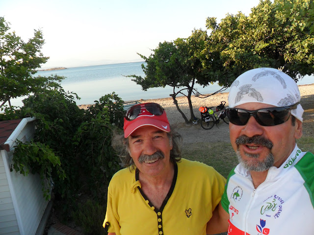 Sürpriz oldu bana,sahile bakınarak giderken,arkası dönük bir bisikletli kamp malzemelerini topluyordu günaydın diye seslendim.Bir de ne göreyim,Şerif Kılavuz ağabeymiş. Hemen sarıldık birbirimize kısa bir hasret gidermece yaptık.O İzmir’ den çıkmış yola, yukarılara, Çanakkale tarafına gidecekmiş.Biraz muhabbetten sonra vedalaşıp birbirimize hayırlı yolculuklar diledik.