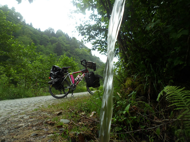 Verçenik-Elevit sapağından sola dönüp Elevit Deresi boyunca Elevit Yaylası’na tırmanmaya başladım,bundan sonra toprak yolda yol alacağım,toprak yol sapaktan döner dönmez başlıyor.Daha yol sapağından döner dönmez hafiften yağmur da başladı, ben yukarılara çıkmaya ve tırmanmaya başladıkça da yağmur bulutunun içinde yol almaya başladım.Çektiğim bu fotoğraflar yolun başlangıcından kalma.Tırmanırken bol yağış iliklerime işledi.Yağmur bulutu içinde sırılsıklam yol alırken iş makine sesleri ve görüntüsü ise hiç hoş değildi.Yol yapım çalışması nedeniyle bazı bölümlerde çamurun içinde ancak bisikletimi ittirerek yol alabildim.Bacaklarımın ve ayaklarımın halini siz düşünün.