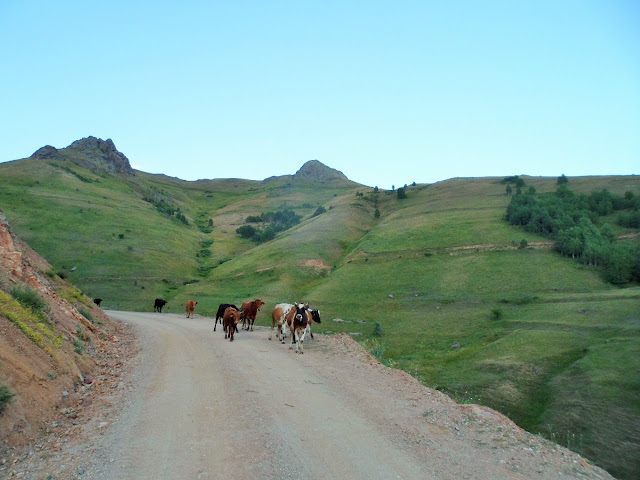 Ulutaş aşağılarda kalırken inekler evlerine gitmekte, hava da karamaya başlamakta.35 kilometre tırmanarak vardığım 2640 metredeki Ovit Geçidinden 2000 rakımdaki Çayırözü köyüne iniş yapıp,şimdi günün ikinci 10 kilometrelik tırmanışı ile 2550 metrelere tırmanmaktayım ama ben de artık bittim.Ulutaş-Moryayla arasında hava kararmaya başladı ve bu arada yoldan dozer geçmiş bu toprak yolda tehlike demek.İnşallah karanlıkta bana sıkıntı çıkarmaz.