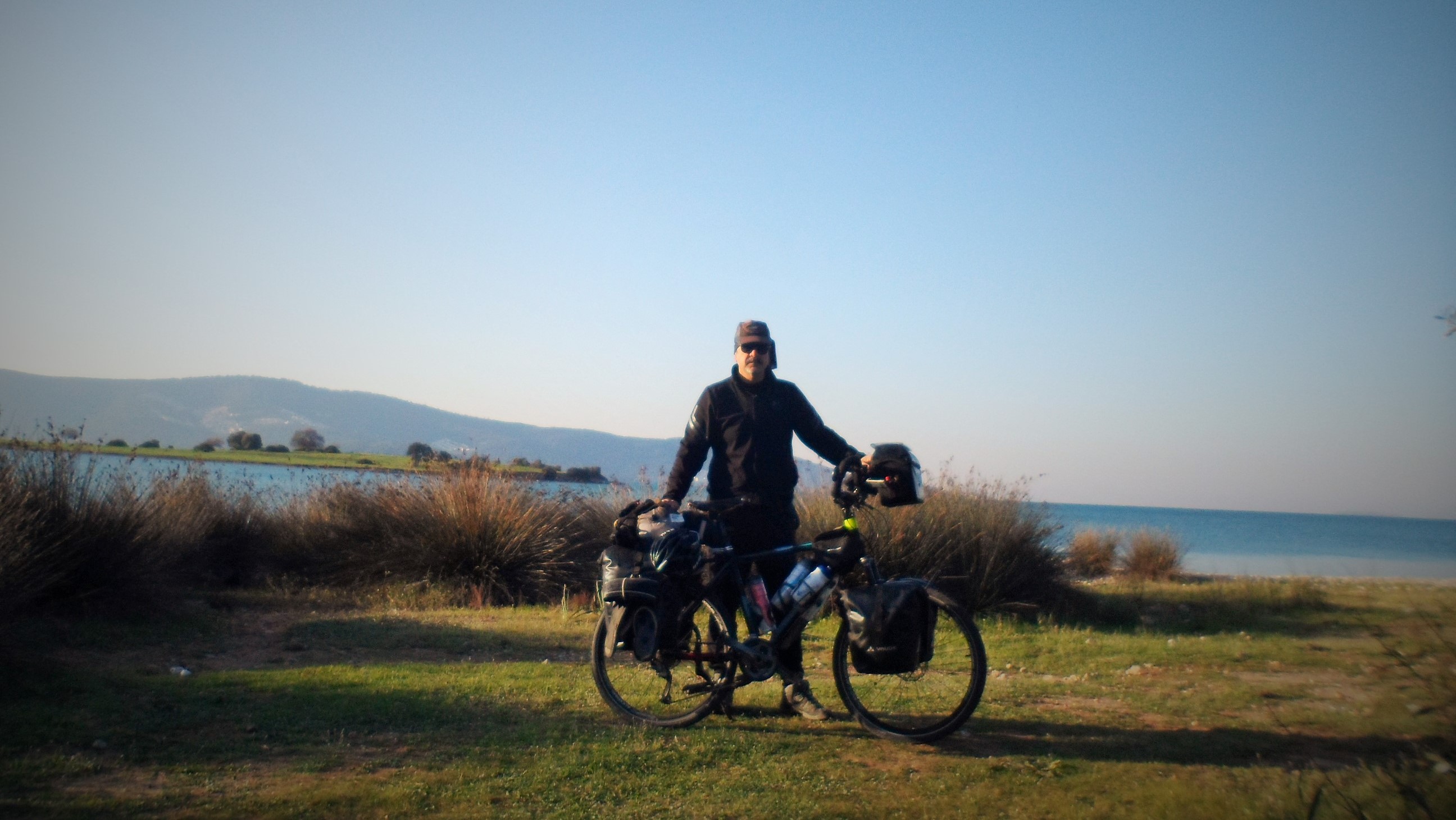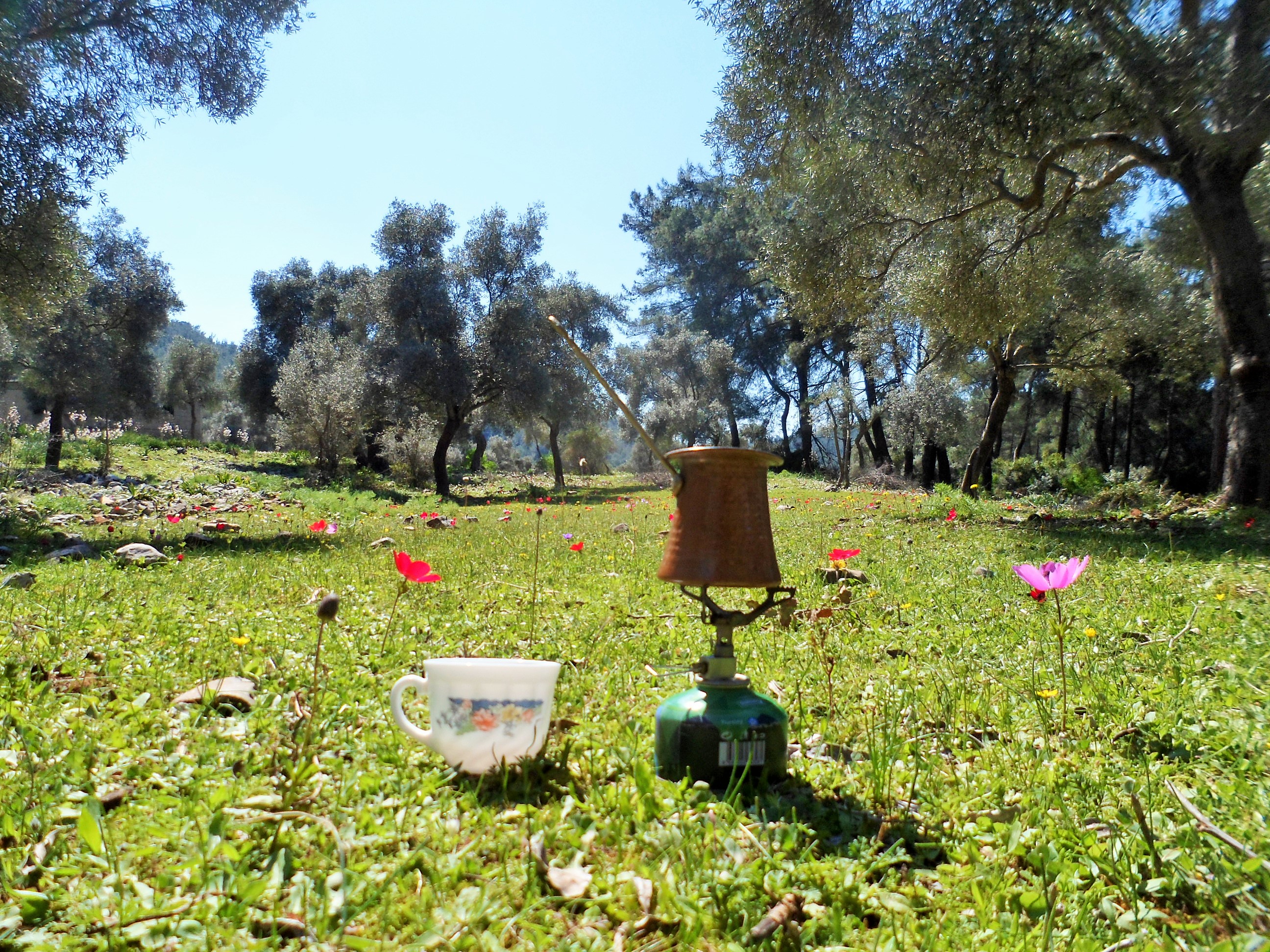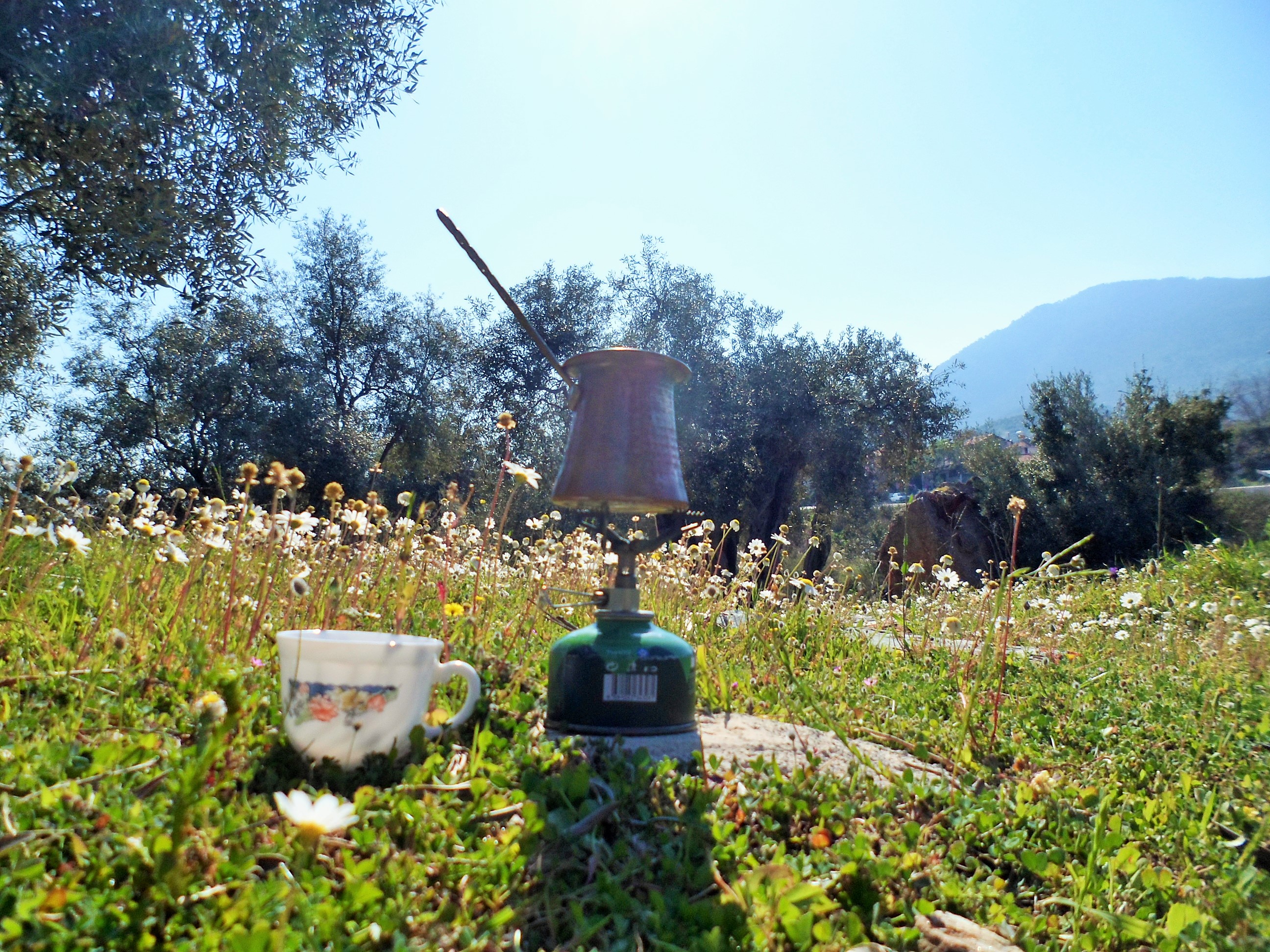 Bafa’yı geçtim Bafa Gölü’ne paralel gidiyorum ve rüzgara karşı yol almaktayım. Rüzgar dediysem hani ilk iki gün beni arkamdan ittiren şiddetli rüzgar var ya!!!! işte o rüzgarları şimdi burundan yiyiyorum.Ve ben bu atmosferde pek te yabana atılmayacak bir yerde , rüzgarsız bir alanda yerimi buluyor ve kahve molası veriyorum. Bu kahve molası bana çok iyi geldi.